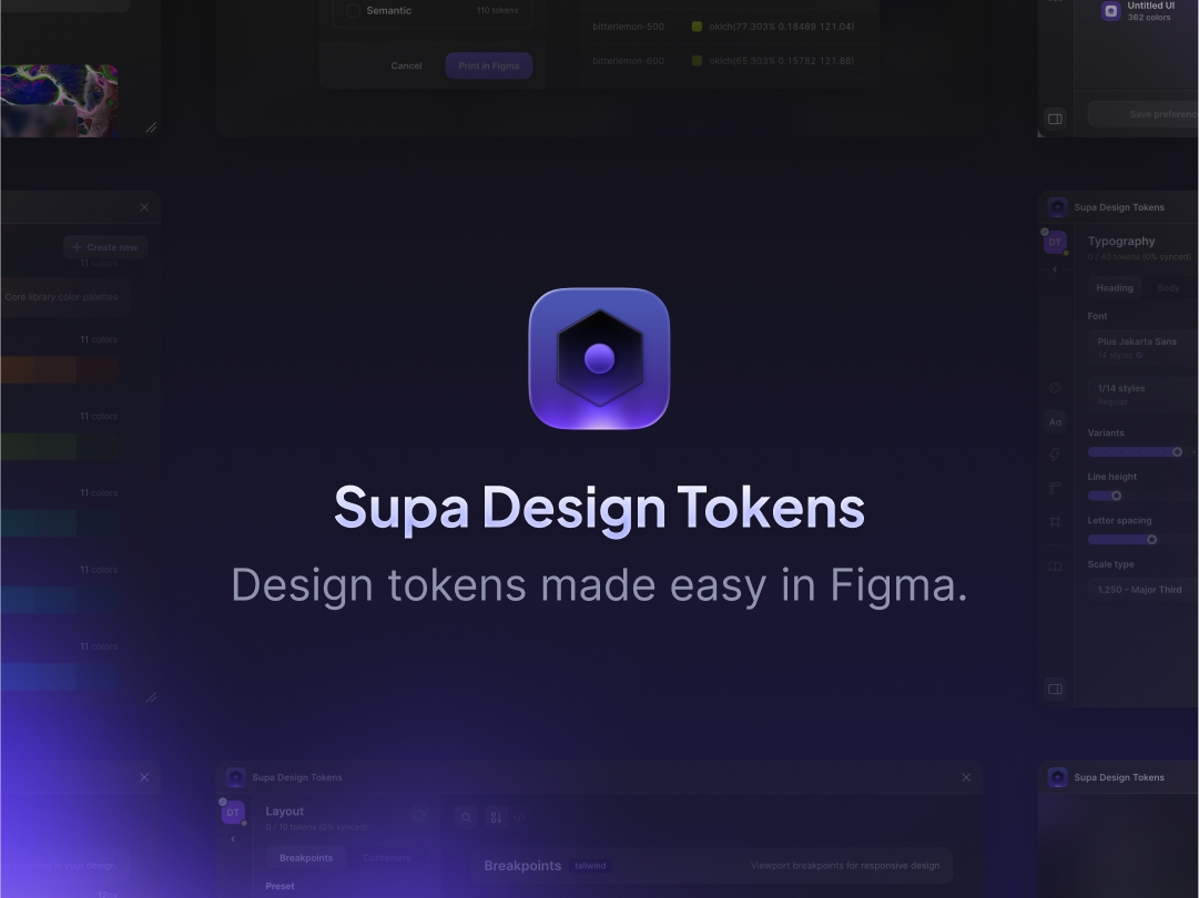 The all-in-one plugin to create, organize, and export tokens—right where you design. Transform your workflow. Build systems that scale effortlessly. Use directly inside Figma. Try the plugin 7-DAY FREE TRIAL Test Supa Design Tokens with no limitations for 7 days.No credit card required, just install the plugin and start building. ONE-TIME PURCHASE (No Subscription) Unlock the full version with a one-time payment.No recurring fees, no surprises, own it forever. To activate:Open Supa Design Tokens Plugin → Preferences → Add License Key Note:You can activate your license on up to N devices (adjustable based on plan).The license is not linked to your email, just share the key with your team members.